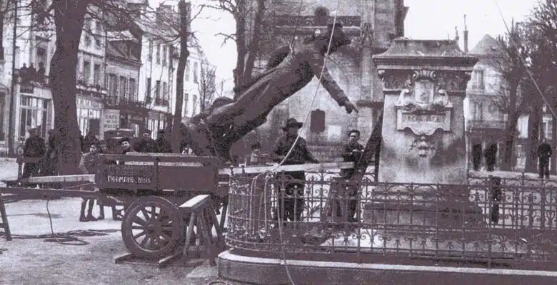 Au grand désespoir des Vendômois, le mardi après-midi 27 janvier 1942, la statue fut déposée sur ordre de l’occupant nazi au titre de la récupération des métaux non ferreux pour alimenter leur effort de guerre. L’opération fut réalisée par une entreprise blésoise (Normand) à l’aide d’un palan et de multiples cordages. Peu nombreux furent les témoins qui assistèrent à cet enlèvement. Pourtant quelques photos furent prises clandestinement, immortalisant la pénible scène. Le lendemain, la statue en pied du poète Ronsard, inaugurée en 1872 dans le jardin du musée, rue Poterie, subissait le même sort.