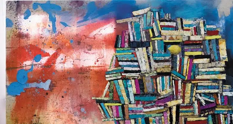 Sa première toile sur le thème des bibliothèques n’aura pas fait long feu. A peine sèche, elle trouve acquéreur en 2005. D’où l’envie d’aller plus loin et de réaliser une exposition personnelle sur ce sujet. Tout ce travail pour arriver à ce que les livres ressemblent à des pixels. L’état à l’accès du savoir est de plus en plus virtuel et abstrait.