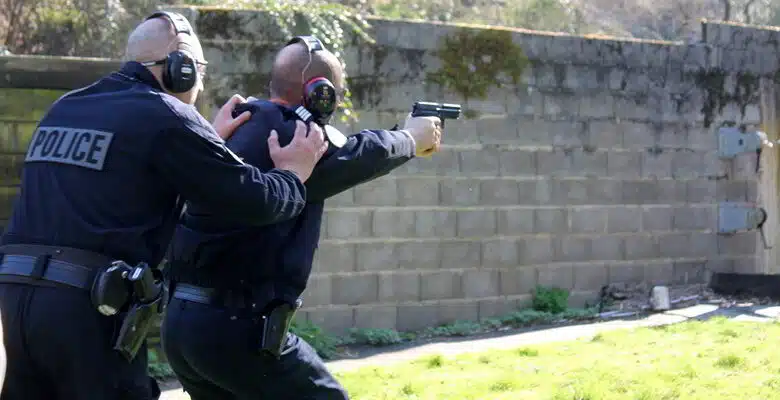 « Vous mettez votre arme en sécurité, face à la cible avec deux chargeurs de 5 » l’instructeur donne ses ordres avant que chaque policier positionne son casque antibruit sur les oreilles, en rappelant les règles de base pour un tir prédictif afin de retrouver les sensations du tir, sa déflagration et son mouvement. Au coup de sifflet, l’odeur de la poudre et le bruit sec viennent troubler le silence de la nature autour du stand de tir. Puis, les exercices s’enchaînent, une balle parfois, deux suivant ce qu’il y a à travailler, tir de réaction quand le danger est proche, rechargement d’urgence, résolution d’incident de tir avec l’éjection de la balle inerte, travail également en binôme l’un dirige l’autre tire. L’instructeur, entre chaque exercice, lit l’impact des balles sur la cible spécifique à la police, une silhouette noire qui pointe une arme, et peut en un coup d’œil remarquer les défauts d’un tir trop à gauche ou à droite et ainsi donner ses conseils aux policiers à l’entraînement par une analyse sensible.