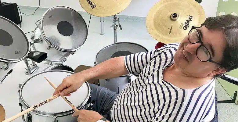 Petites lunettes cerclées, marinière et baskets aux pieds, le quadra affiche ses références musicales : AC/DC, Metallica, Téléphone. A 14 ans, il se met à la batterie «parce qu’il en aimait bien le son et que ça lui permettait de jouer avec tout le monde, les batteurs étant plutôt une denrée rare». Depuis le drame, qui lui a occasionné un coma de deux mois, un traumatisme crânien, des lésions cérébrales irréversibles, il est en fauteuil roulant. Il y a quatre ans, il intègre un programme d’accompagnement musical à la demande de sa famille, accompagné dans cette démarche par l’Hospitalet, après consultation d’un médecin et sous la conduite d’un intervenant extérieur, Guido Zatilla, un guitariste vendômois. «La mémoire de la pratique lui est revenue au fil des séances. Il avait un gros problème pour se servir de sa cymbale de charleston, aujourd’hui, tout est débloqué», se réjouit le guitariste. Au début, Denis jouait uniquement de la caisse claire avec sa main gauche et de la grosse caisse avec son pied droit. Compliqué pour un batteur quand on sait que l’instrument sollicite les quatre membres et une désynchronisation quasi horlogère.