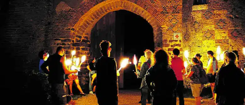Munis de flambeaux, les visiteurs sont plongés hors du temps, alors que les ombres s’allongent à la lueur des torches et que la nuit enveloppe le site. Compléments d’histoire et récits d’anecdotes émaillent cette balade nocturne conduite par un médiateur de la commanderie. La visite est suivie d’un moment de partage autour d’un verre.