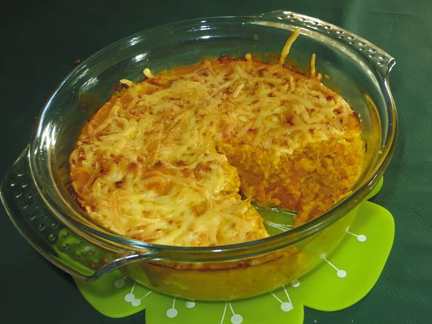 – Beurrer le plat à gratin ; y verser le mélange à base de potiron. Râper le gruyère puis le saupoudrer sur le gratin.