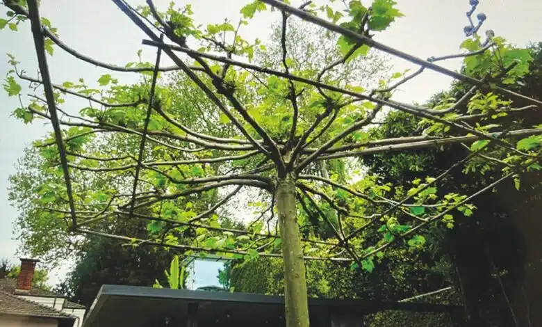 Le platane se prête bien à l’exercice. Le mûrier platane est intéressant pour ses jolies feuilles vertes luisantes découpées qui tombent tardivement à l’automne d’une seule chute. La variété «Fruitless» est stérile ce qui dispense la chute journalière sur les terrasses privées ou de café-restaurants, lieux de convivialité.